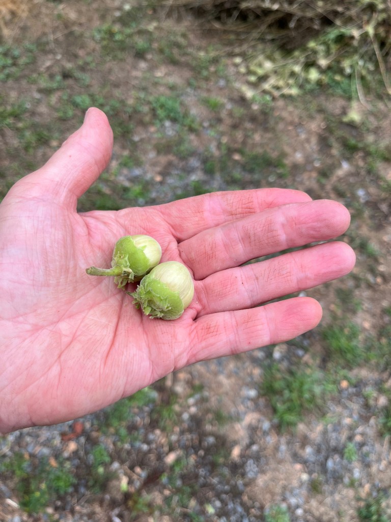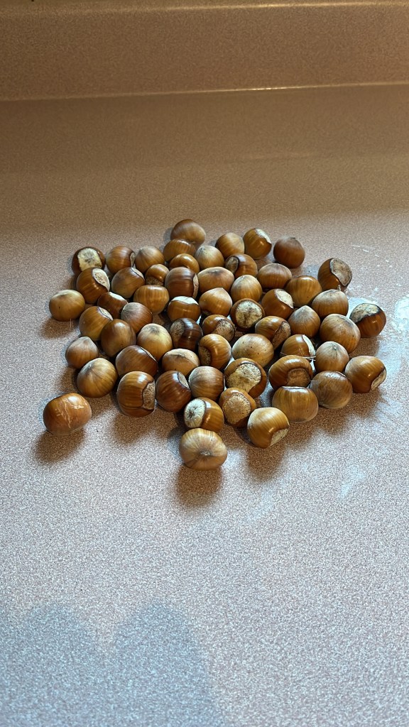 We didn’t get the bumper-crop of hazelnuts we’d hoped. The squirrels got to them first. Still, the small offering which remained was tasty!