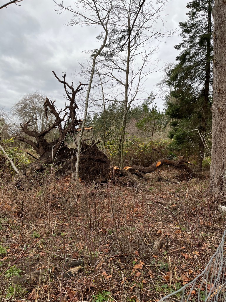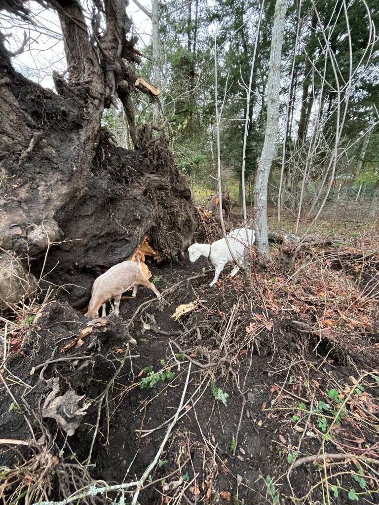We had an extraordinary wind storm. The wind blew in completely the opposite direction and uprooted an eighty foot douglas fir. The tree came down between two fencelines with the root-ball a whisker away from the fenceline. Created quite a challenge pulling the fence back up. The goats enjoy playing in the root-ball though!