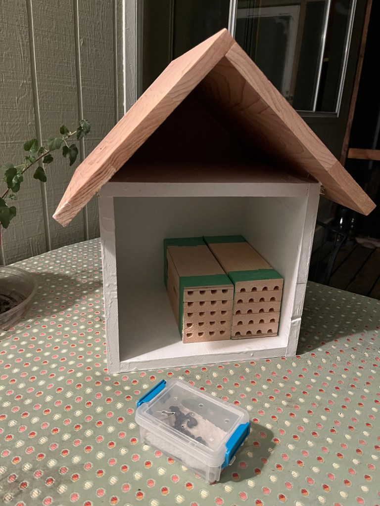 A dear friend made a mason bee house for us! With his help, we learned how to clean mason bee cocoons and save them over winter in the crisper drawer of the fridge. LOL, not for the faint of heart! Looking forward to putting them out and seeing them hatch then lay eggs in their new mansion!