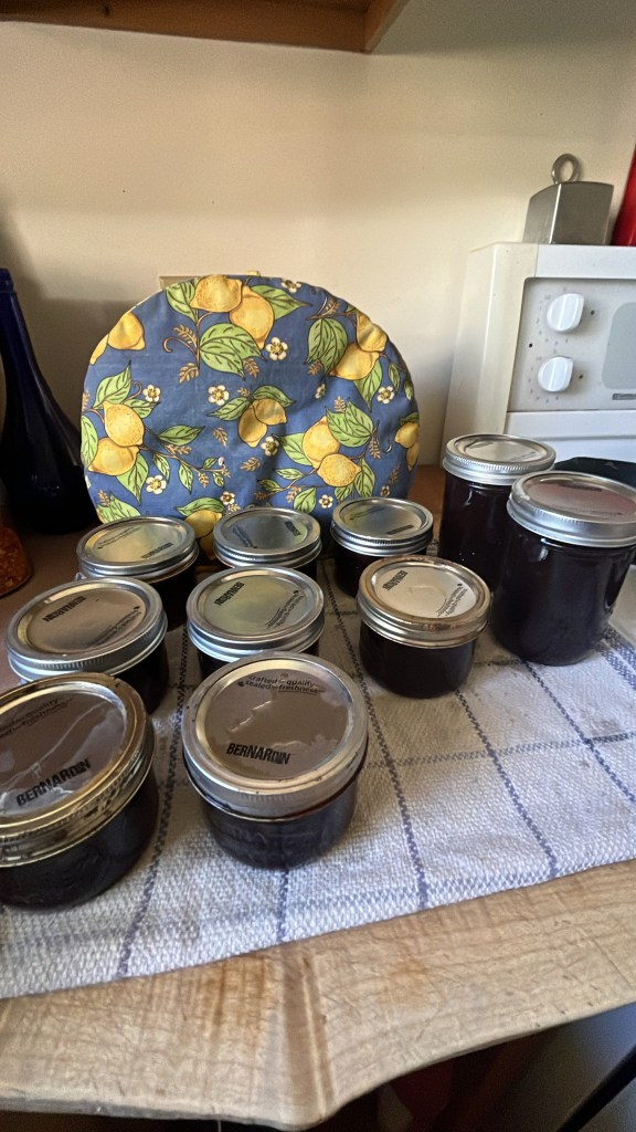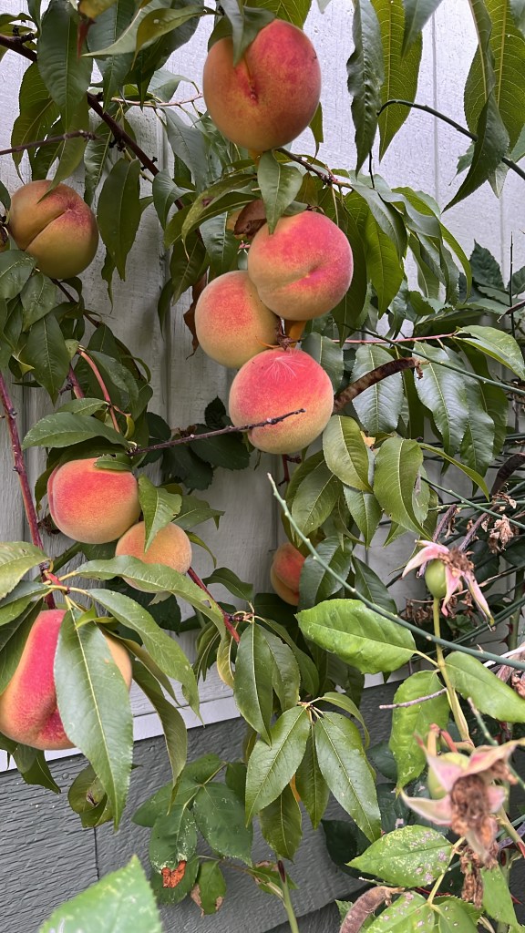 Despite having the worst case of peach leaf curl I’ve ever seen, this little peach tree produced just the right amount of exquisite peaches. None made it into canning jars. They were all eaten!