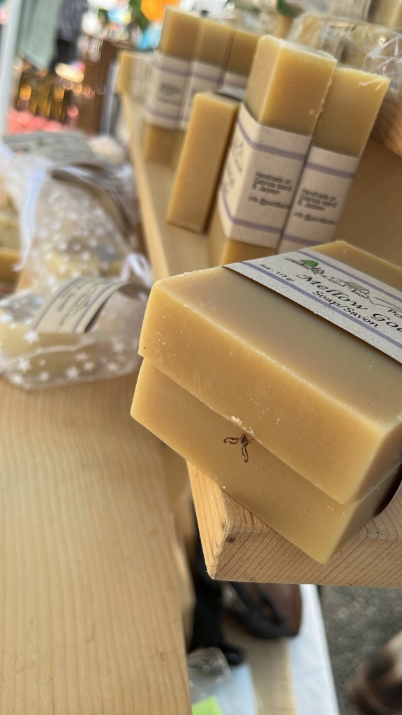 Look closely at the bar of soap in the picture and you will see the most exquisite tiny wasp sitting on the soap label. It seemed to enjoy being part of the market vibe that day. Unless I pointed it out, no-one was the wiser it was there.
