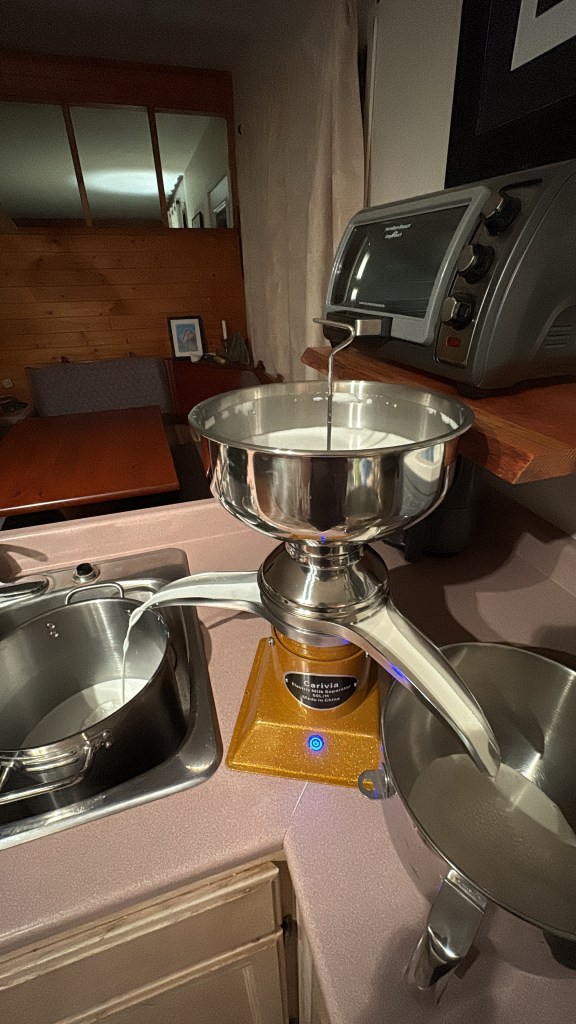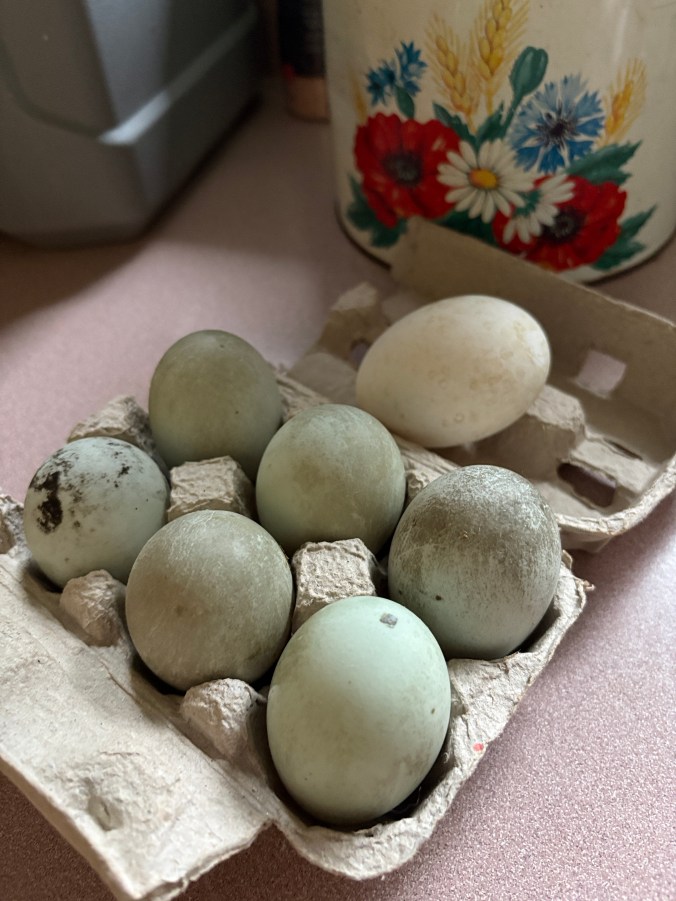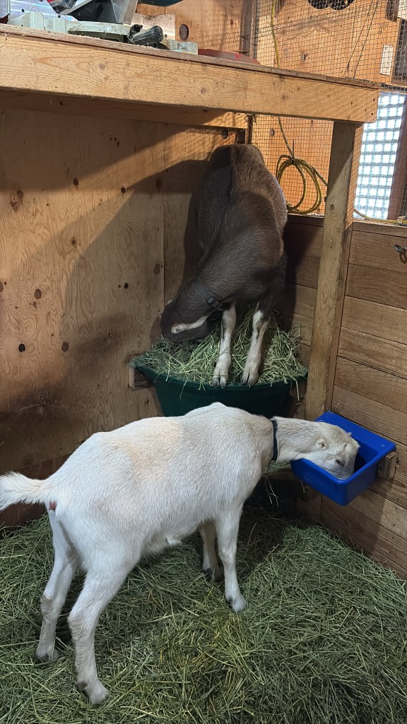 At the moment we don’t have chickens but are contemplating raising a small number (25 or so) meat birds in the Spring. The price per chick went up dramatically this year and we’re hoping the price at least stays the same. The price of feed, both grain and alfalfa went up, so we’re scaling things to manageable proportions – at least that’s the plan. Part of it is to breed and milk one goat in 2026. Milking two goats this year meant we had litres of milk in the freezer in record time. All saved for future use in our soap or for our consumption.