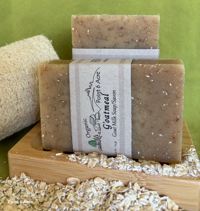 This soap contains Organic Olea europaea (olive) oil, Raw goat milk, Organic sustainable Elaeis guineensis (palm) oil, Organic Cocos nucifera (Coconut) oil, Organic Prunus amygdalus dulsis (sweet almond oil), and Organic Colloidal Oatmeal (organic ground oatmeal).